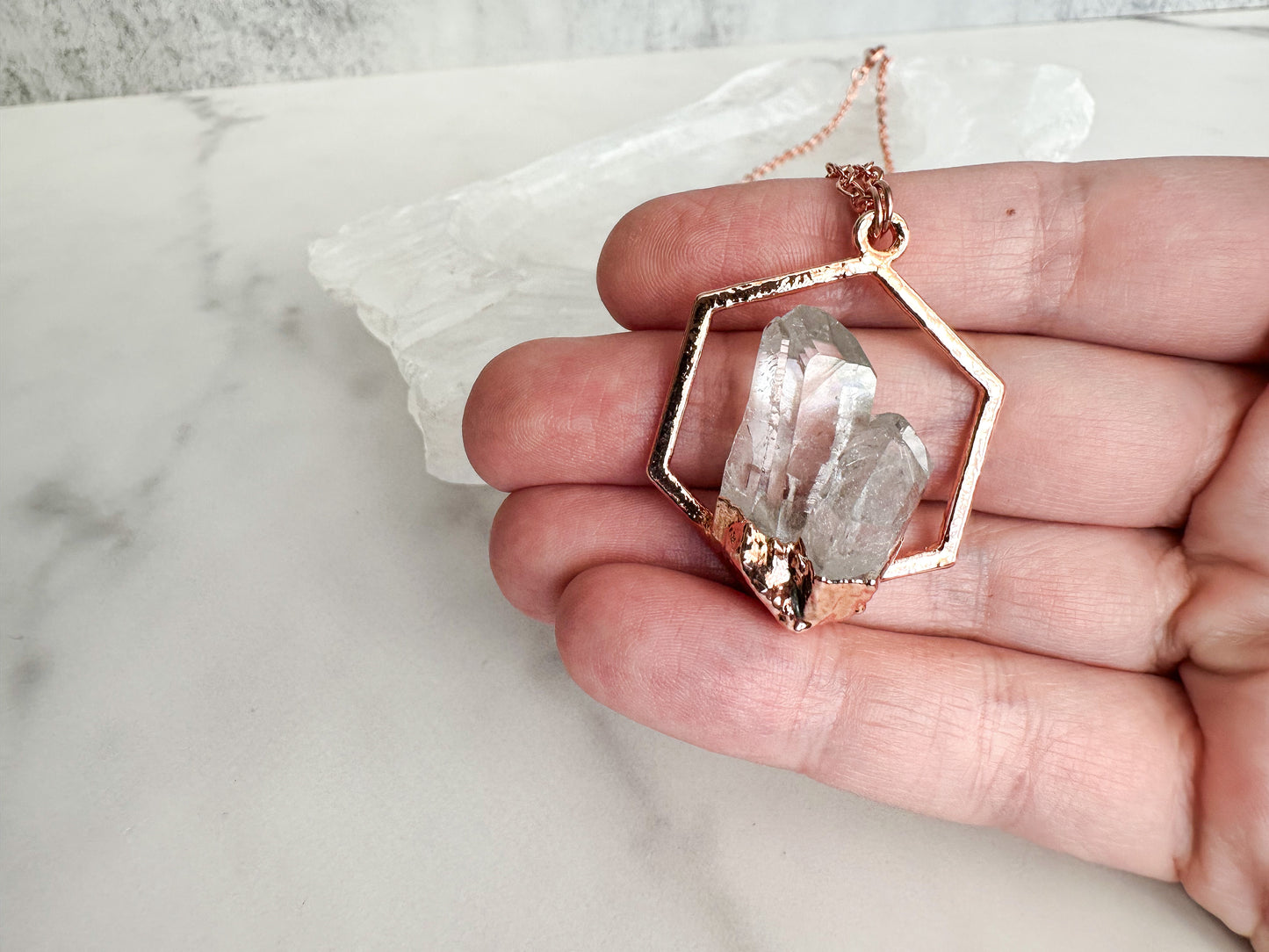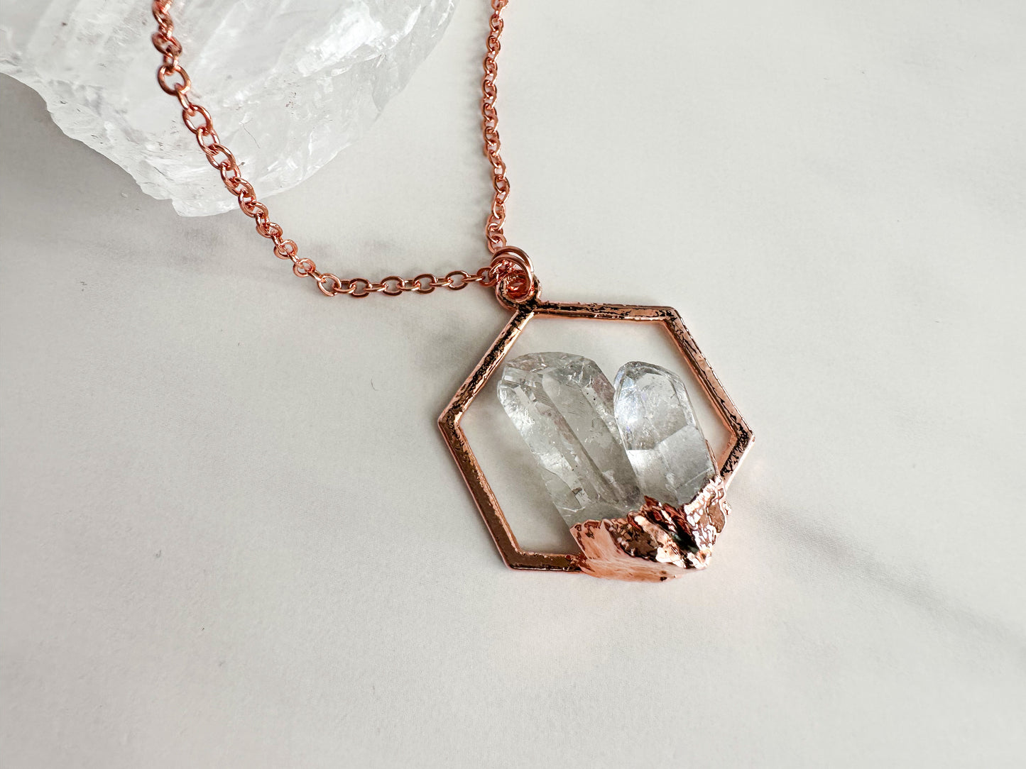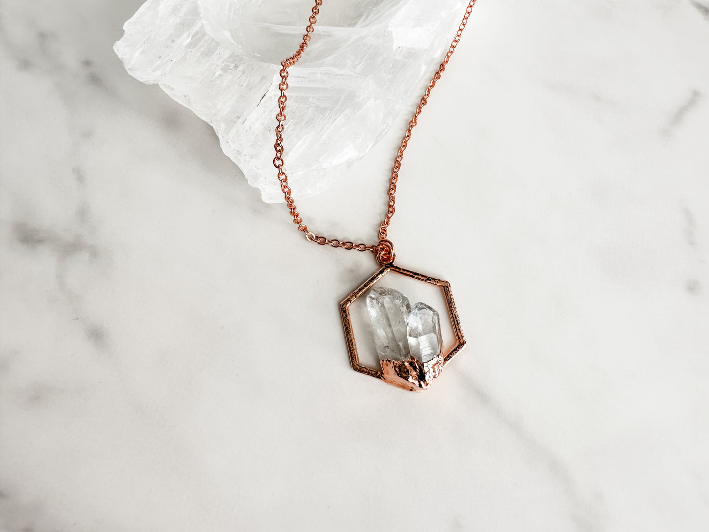 This Clear Quartz Cluster necklace was created through a process called electroforming, where tiny particles of copper are deposited onto a conductive surface via electricity in a copper solution, over the period of several hours. Once formed in copper, you can either leave it as is or we can either patina it to give an antique finish, or send it off to be plated in the thickest plate of 14kt gold or silver. The necklace dangles from a beautifully sturdy 18 inch, copper chain. If you would like a different length (up to 24 inches), please leave a message in the notes section.