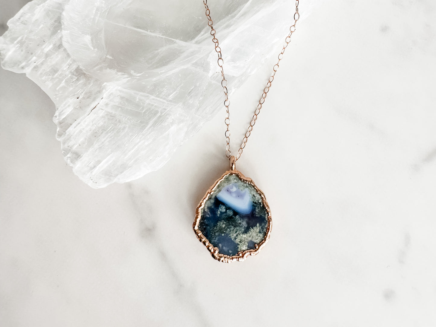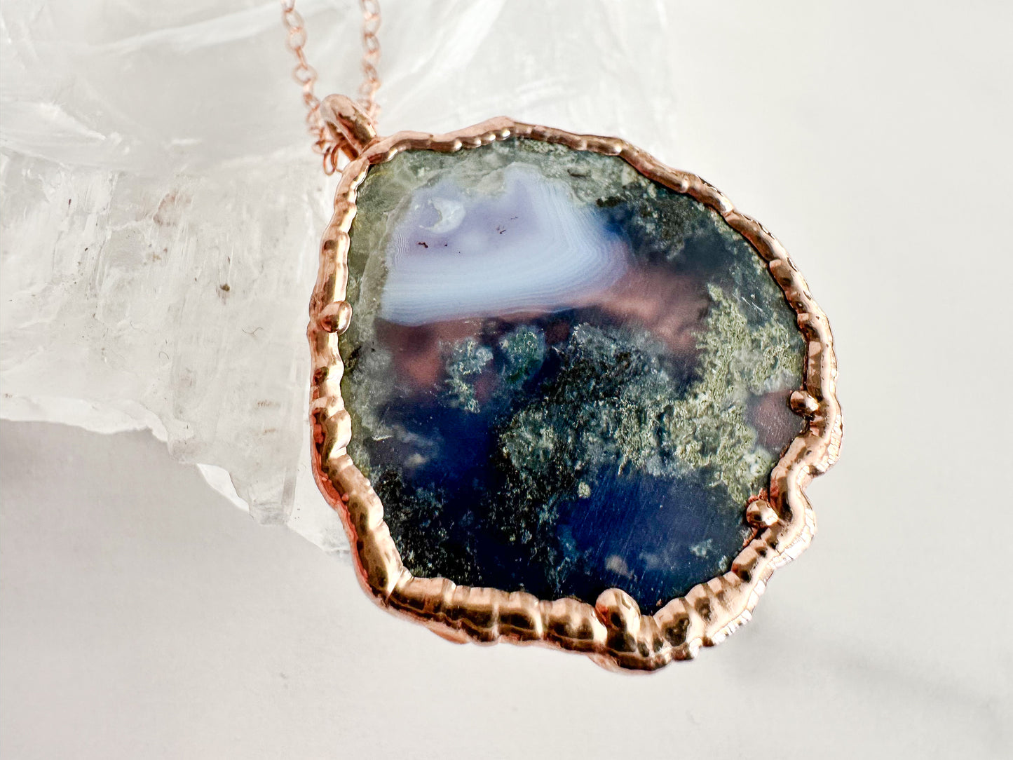 This Purple Moss Agate necklace was created through a process called electroforming, where tiny particles of copper are deposited onto a conductive surface via electricity in a copper solution, over the period of several hours. Once formed in copper, the piece is then plated in the thickest layer of Rose Gold and sealed to preserve the plating for as long as possible.The necklace dangles from a beautifully sturdy 18 inch, rose gold filled chain. If you would like a different length (up to 24 inches), please leave a message in the notes section.