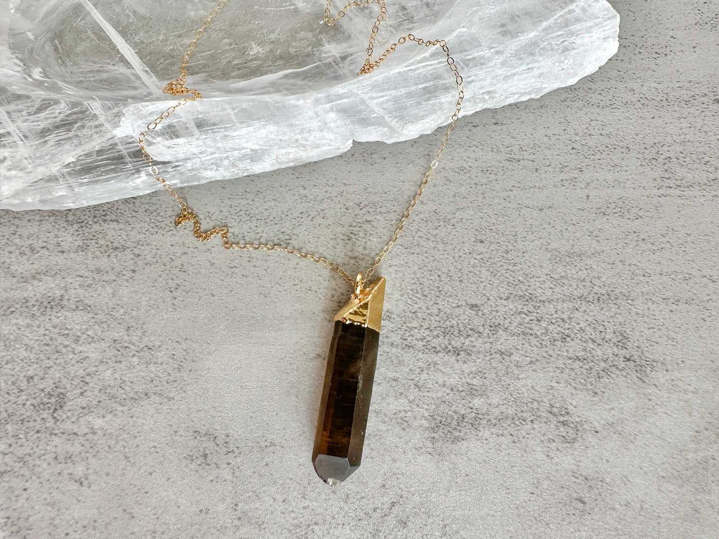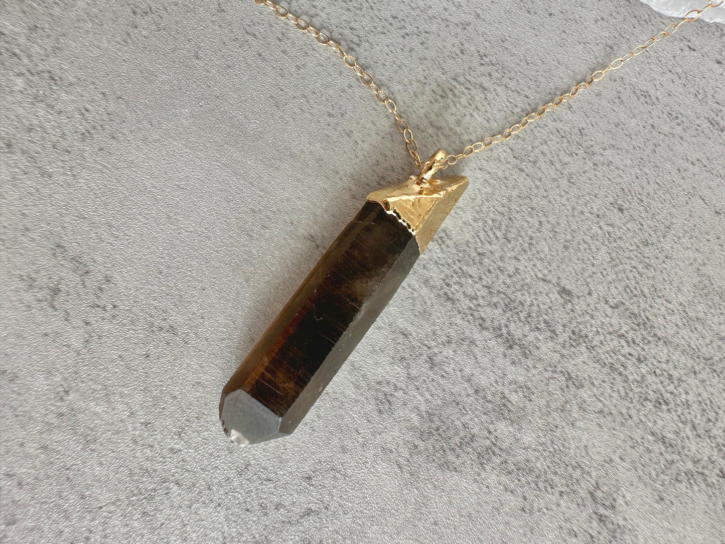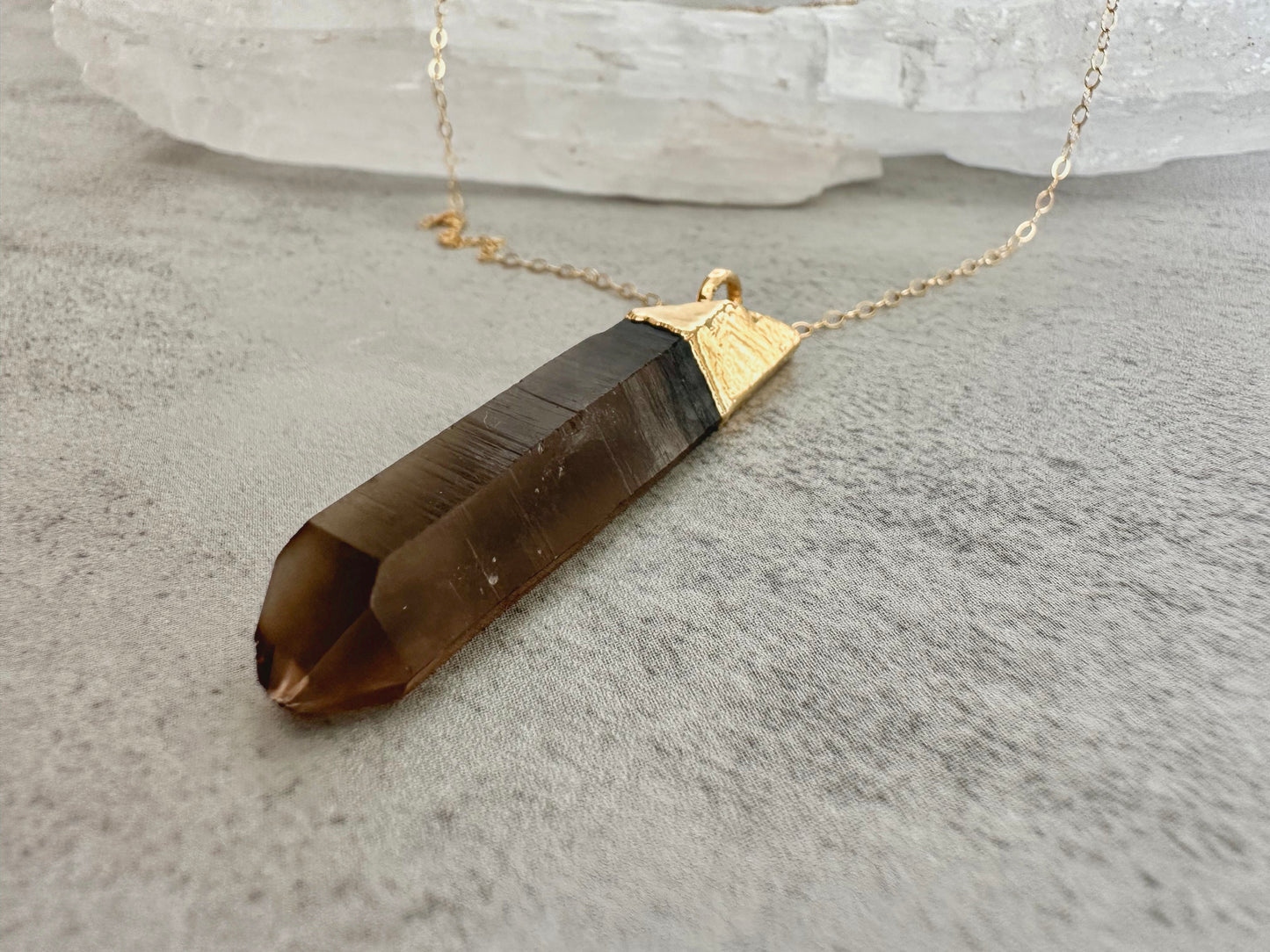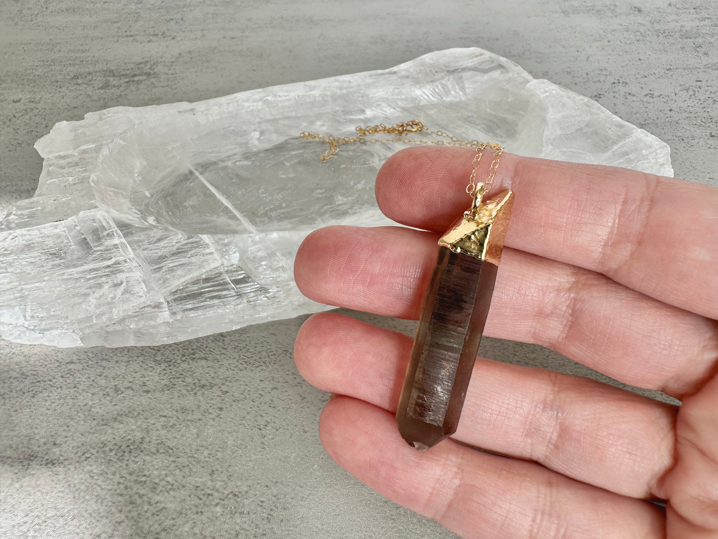This beautiful, smokey quartz necklace was created through a process called electroforming, where tiny particles of copper are deposited onto a conductive surface via electricity in a copper solution, over the period of several hours. Once formed in copper, the piece is then plated in the thickest layer of 14 karat gold and sealed to preserve the plating for as long as possible.The necklace dangles from a beautifully sturdy 18 inch, 14 karat gold filled chain. If you would like a different length (up to 24 inches), please leave a message in the notes section.