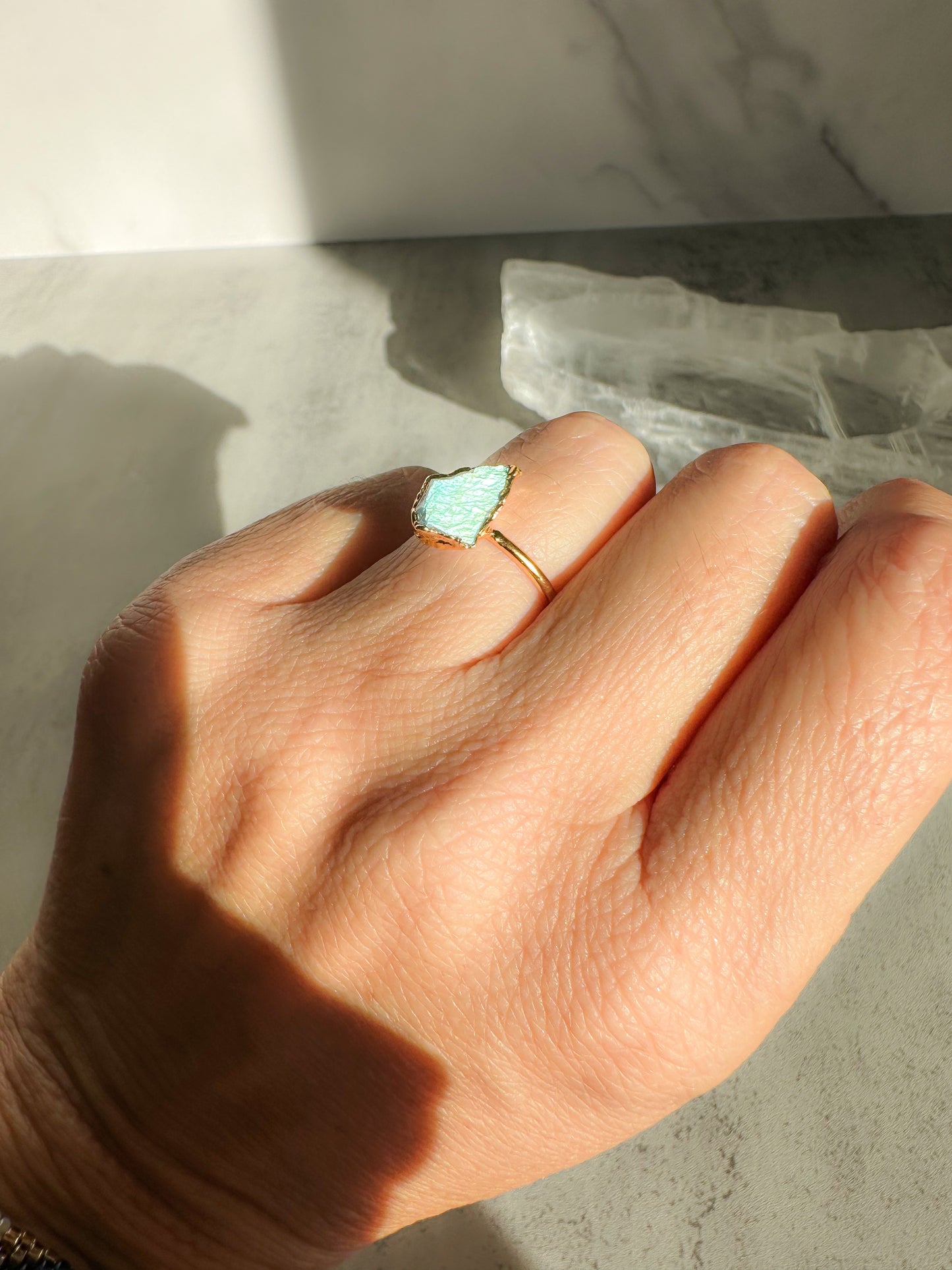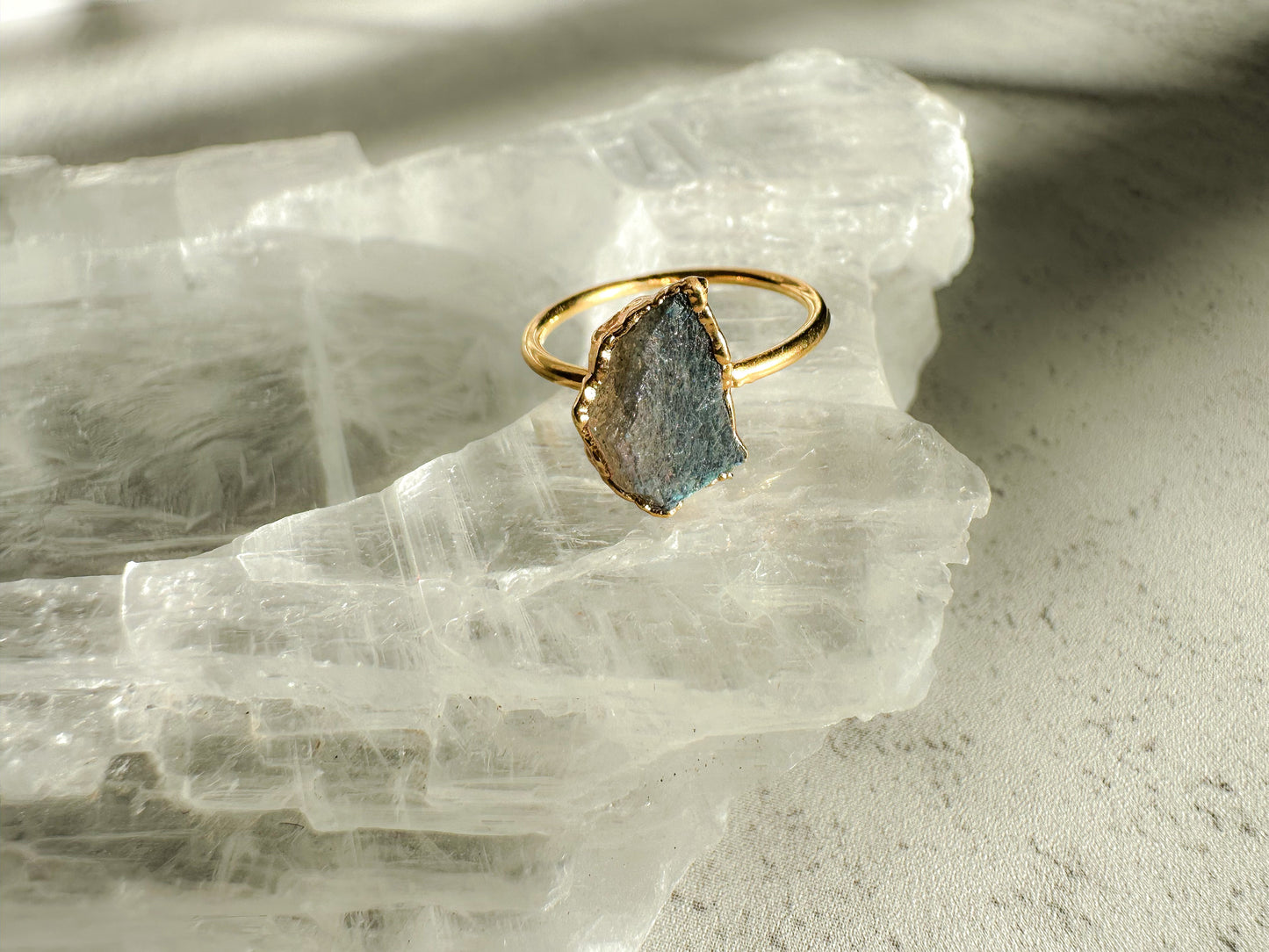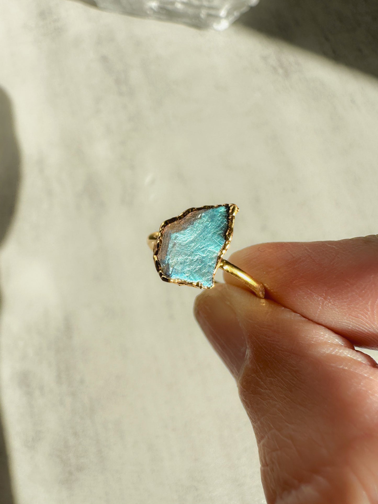 This Spectrolite ring is plated in 14 karat gold and is a size 5.75.