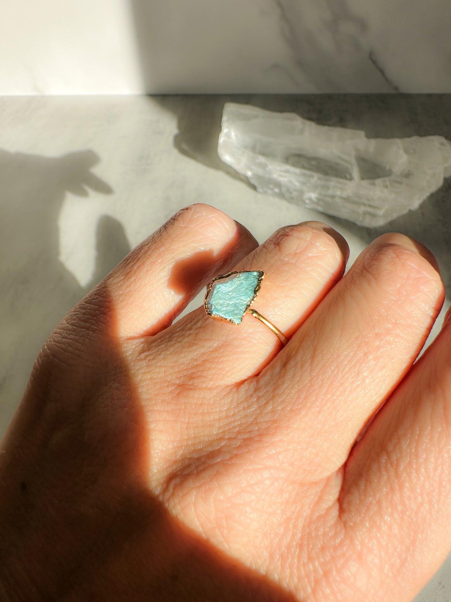 The ring was created through a process called electroforming, where tiny particles of copper are deposited onto a conductive surface via electricity in a copper solution, over the period of several hours. Once formed in copper, the piece is then plated in the thickest layer of 14 karat gold and sealed to preserve the plating for as long as possible.