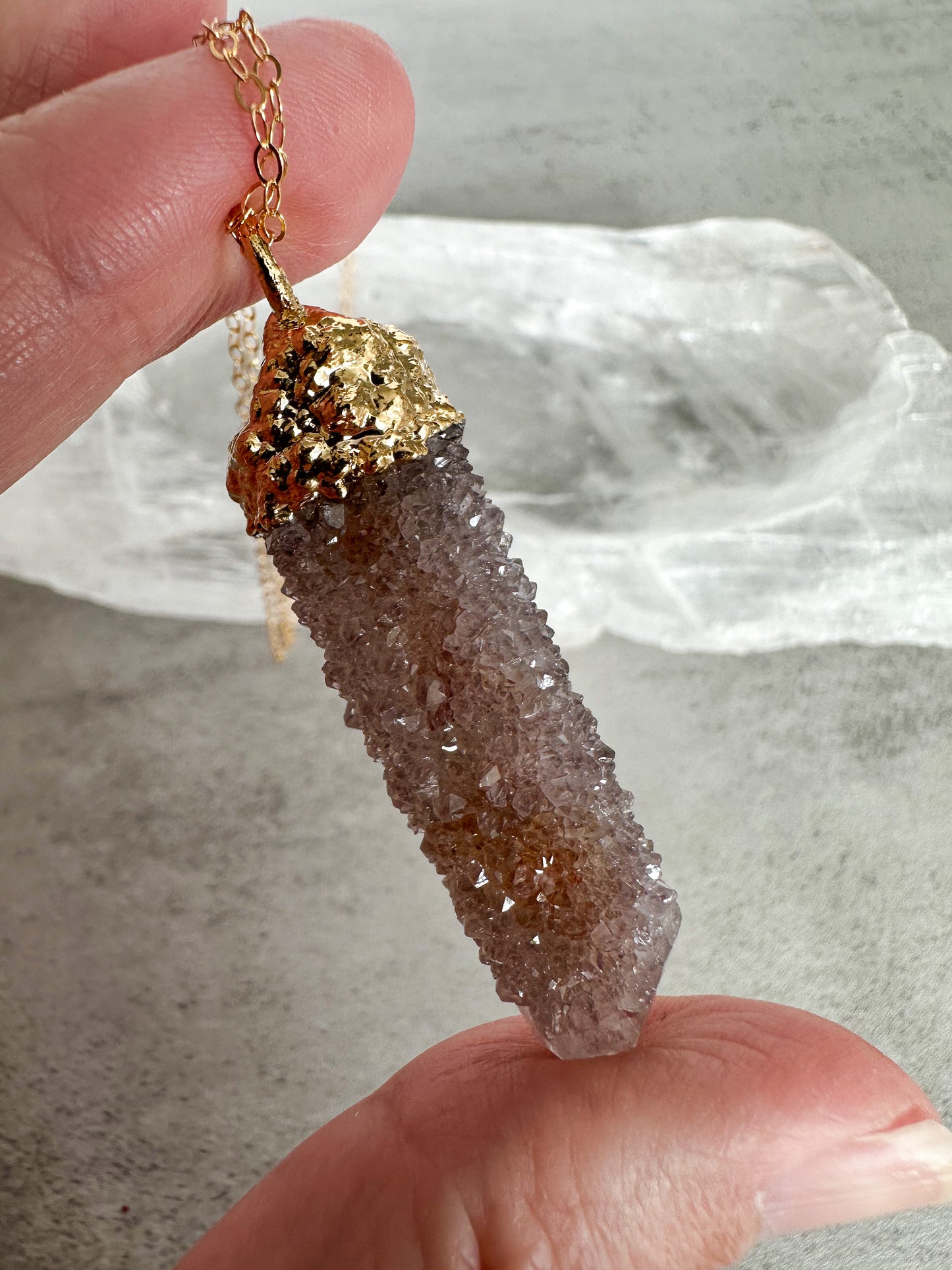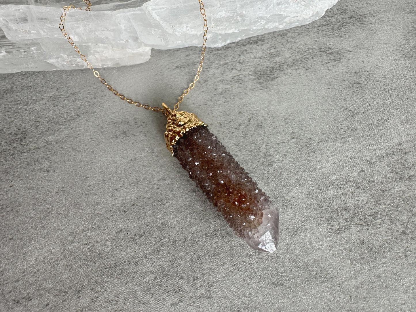 This Spirit Quartz necklace was created through a process called electroforming, where tiny particles of copper are deposited onto a conductive surface via electricity in a copper solution, over the period of several hours. Once formed in copper, the piece is then plated in the thickest layer of 14kt gold and sealed to preserve the plating for as long as possible. The necklace dangles from a beautifully sturdy 18 inch, 14 kt gold filled chain. If you would like a different length (up to 24 inches), please leave a message in the notes section.